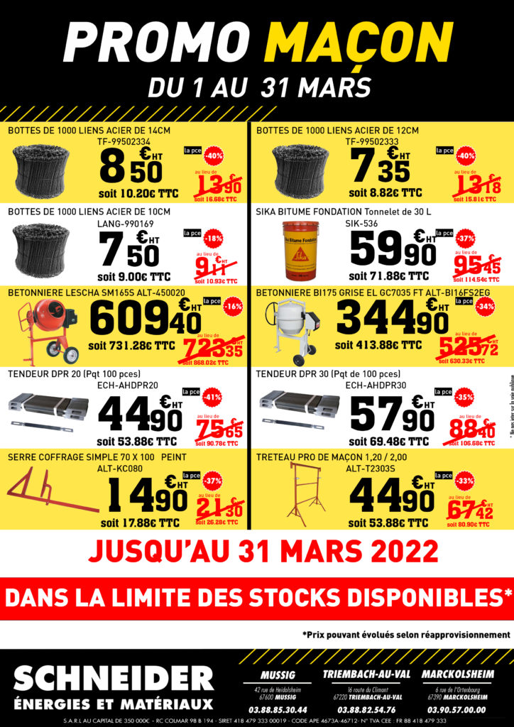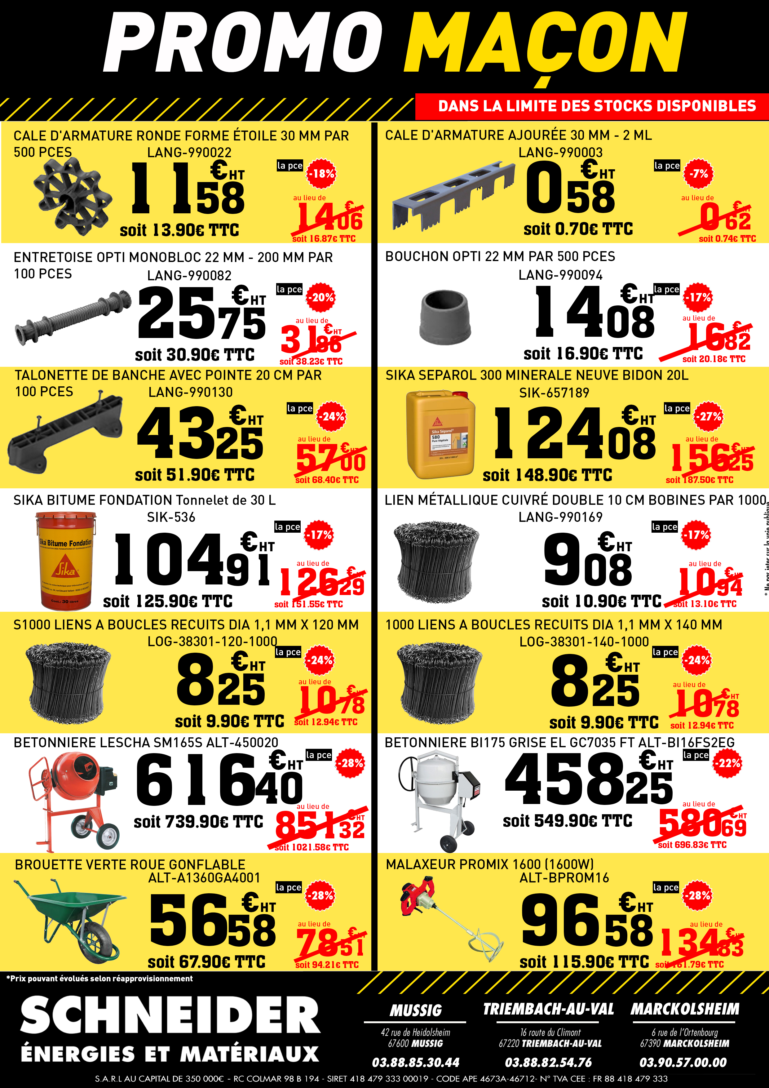 🚨Du 28 septembre au 24 octobre, découvrez une sélection de produits pour vous les maçons ainsi que les couvreurs en stock limité ! ⚒😄Commandez directement en ligne : www.schneider-materiaux.fr ou directement par téléphone au 03 88 85 30 44 ! 🚨